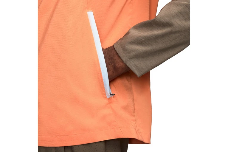 Het jack kan worden opgeborgen in de zak op het achtervlak wanneer je een laagje uit wilt trekken. Dankzij de band over de schouder kun je het kledingstuk eenvoudig meenemen als je onderweg bent.
