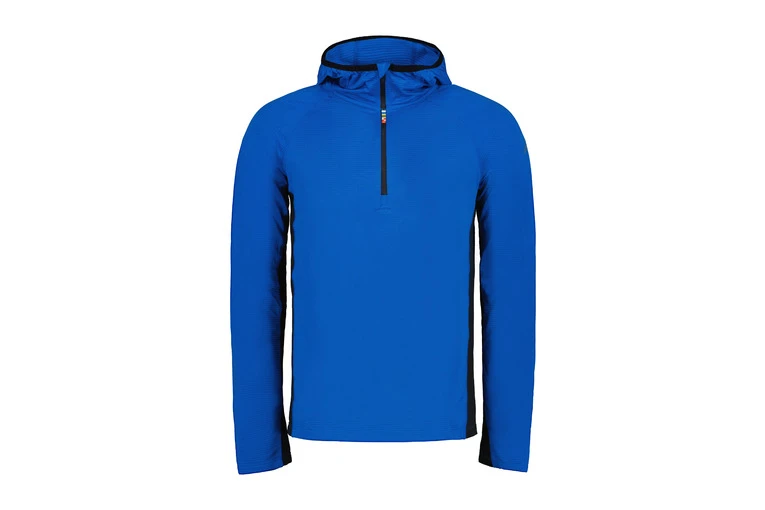 Men’s running hoody. A simple yet functional long-sleeved shirt with fixed hood and half zip. The hoody is great on its own, but it is also well suited to be worn as a midlayer under a jacket. The 2-way-stretch fabric doesn’t restrict movements. There is a handy key pocket on the back as well.